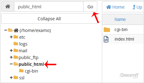 4. Navigate to the directory where you want to upload your files. For example, should you wish to upload your file to the public HTML folder, you need to go to /public_html first. On the left side, you can see a list of directories. Double Click on the public_html folder.
